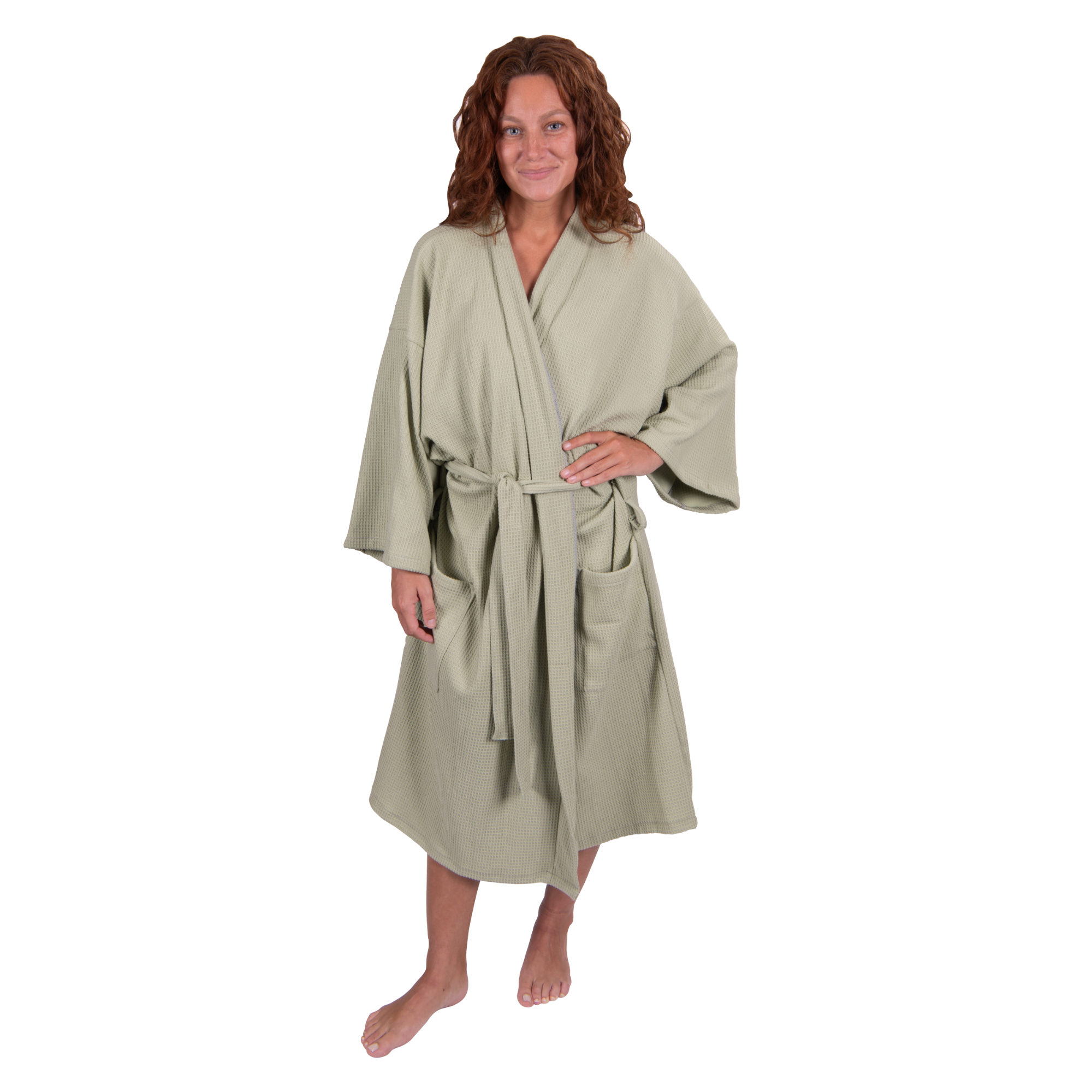 Soft, comfortable, spa robe is ideal for spa and skincare treatments. Absorbent, breathable fabric feels soft and luxurious on the skin. Waffle weave, kimono-style robe has 2 deep front pockets, a tie belt with belt loops, and a convenient hang loop. Machine washable. One size fits most. Sage green.