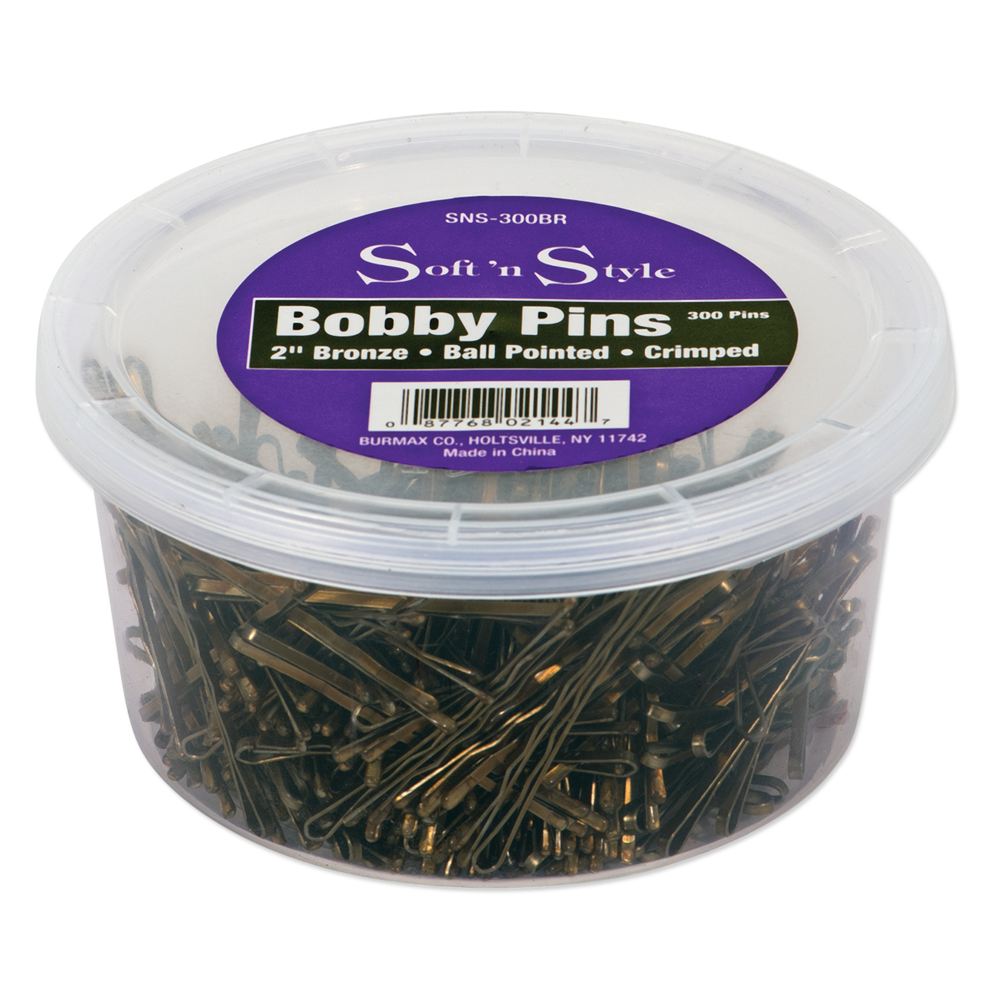 Great for updos, holding hair in place, and securing flyaways. Bronze, crimped bobby pins have ball pointed ends that glide smoothly through the hair without scratching the scalp to secure any style. Crimped design grips the hair and stays snugly in place. Bronze color is ideal for bronze, red, or lighter hair. 300 - 2" bobby pins in a resealable plastic container.